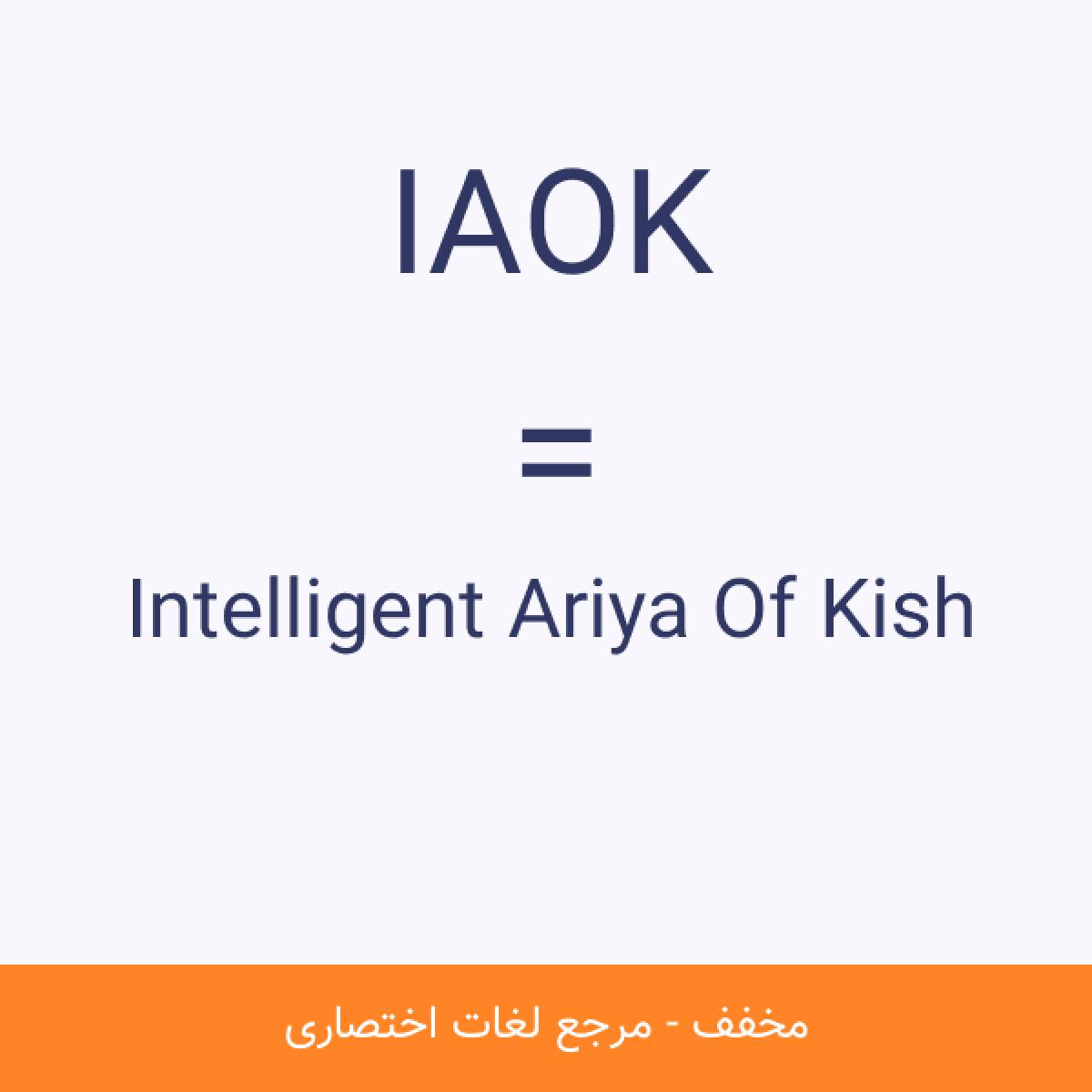 مخفف IAOK Intelligent Ariya Of Kish IAOK مخفف شرکت آریا هوشمند کیش است.اهداف این شرکت: طراحی ، اجرا، نظارت و آموزش ، صادرات - واردات کالاهای مرتبط با هوشمندسازی ساختمان ها و ارتباط مخابراتی و دیتامشاهده نسخه کامل