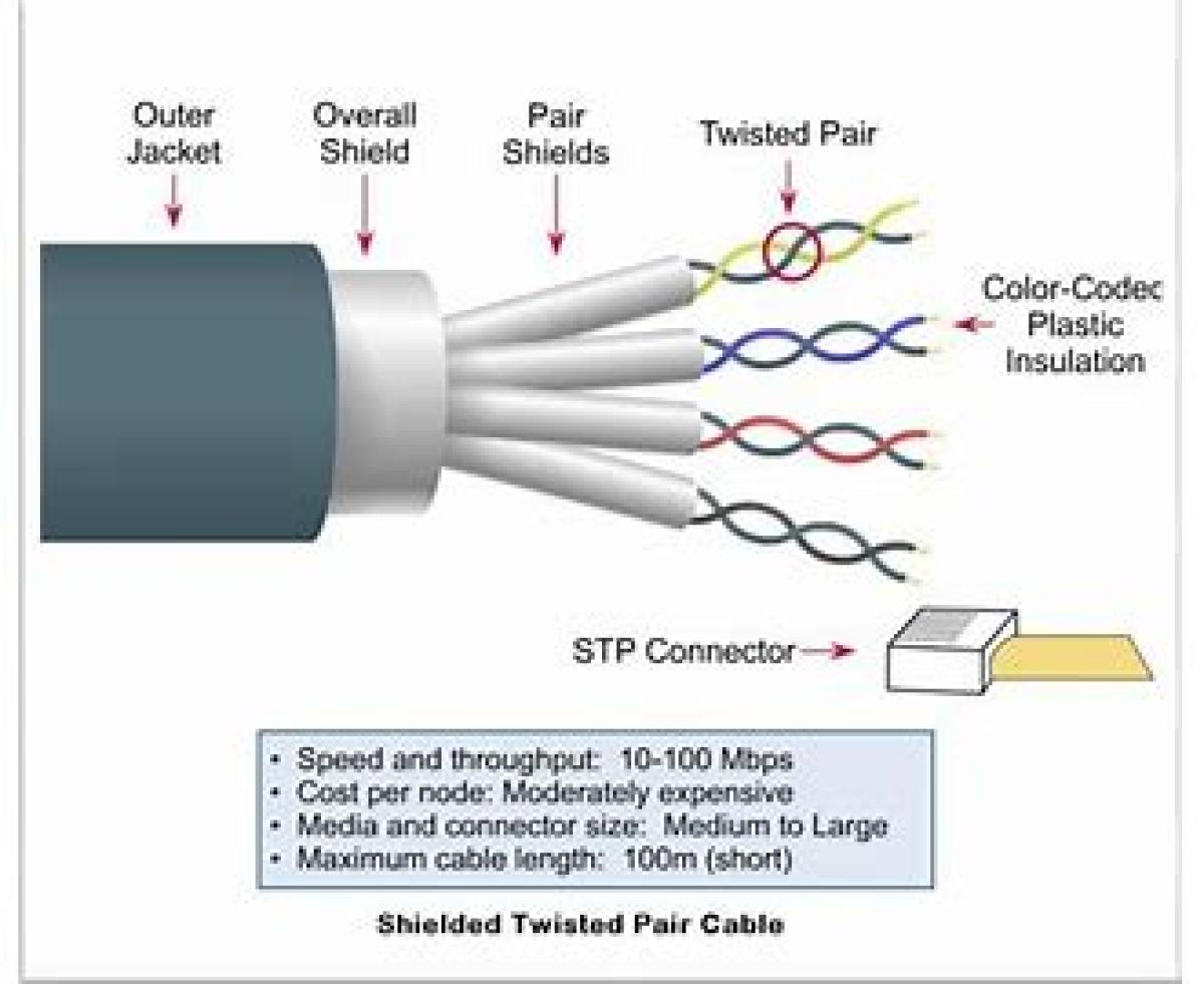 در كابل STP سيمهای انتقال ديتا مانند UTP هشت سيم و يا چهار جفت دوتايي هستند. بايد دانست كه تفاوت آن با UTP در اين است كه پوستهاي به دور آن پيچيده شده كه از اثرگذاري امواج بر روي ديتا جلوگيري ميكند. از لحاظ قيمت، اين كابل از UTP گرانتر و از فيبر نوري ارزانتر است. مقدار مسافتي كه كابل مذكور بدون افت سيگنال طي مي كند برابر با 500 متر معادل 1640 فوت است.
