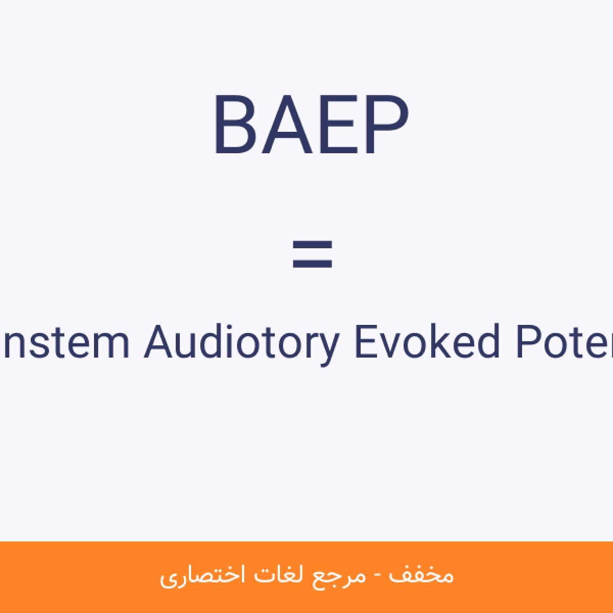 مخفف BAEP Brainstem Audiotory Evoked Potential پتانسیل برانگیختۀ شنوایی تنۀ مغز (بخشی از پتانسیل برانگیختۀ شنوایی ثبتشده که از تنۀ مغز ناشی میشود.)مشاهده نسخه کامل