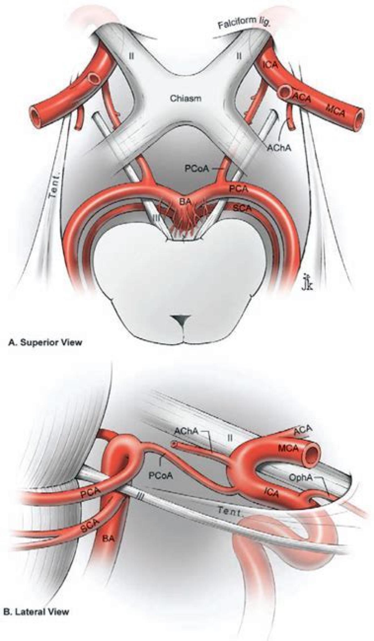 سرخرگ ارتباطی پسین در هر طرف به سرخرگ مغزی پسین همان سمت می‌پیوندد. دو سرخرگ مغزی پشتی از سرخرگ قاعده‌ای منشعب می‌گردند. این دو سرخرگ (سرخرگ‌های مغزی پسین) از اجزای حلقه ویلیس هستند.