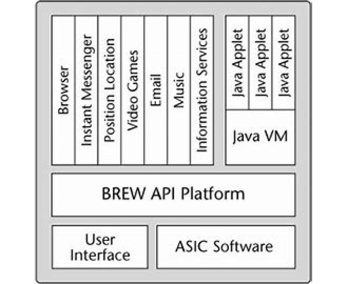 BREW ( محیط زمان جریان دودویی برای بی سیم ) یک راه حل ایجادشده توسط Qualcomm برای دانلود کردن نرم افزارهای کوچک و محتوا به موبایل است . منحصرا در تلفن های CDMA یافت می شود . اجزای اصلی آن به کاربر امکان می دهد که نرم افزارهای کوچک را روی وسایل بی سیم مانند تلفن ها دانلود و اجرا کند . چنین نرم افزارهایی شامل بازی ها ، نرم افزار پی گیری هزینه یا ابزارهای نقشه برهم کنشی می باشد . این جزء BREW با J2ME رقابت می کند که یک تکنولوژی جاوا از Sun Microsystems است . بطور کلی ، BREW و جاوا سازگار نیستند.