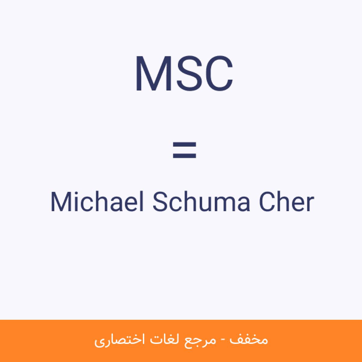 مخفف MSC Michael Schuma Cher میشائل شوماخر (به آلمانی: Michael Schumacher) متولد ۳ ژانویه ۱۹۶۹ در شهر هورت در ایالت نوردراین-وستفالن در آلمان، رانندهٔ آلمانی مسابقات فرمول یک است.مشاهده نسخه کامل