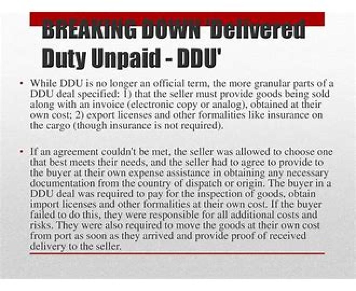 مخفف DDU Delivered Duty Unpaid تحویل در مقصد بدون پرداخت حقوق و عوارض گمرکی. فروشنده کالا را در کشور مقصد بدون انجام ترخیص کالا برای ورود و پرداخت عوارض تحویل دهد.مشاهده نسخه کامل