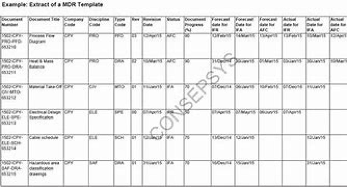 مخفف MDR Master Document Register لیست کلیه مدارک مهندسی که توسط پیمانکار و در بخش مهندسی پروژه (Engineering) تهیه و یا طراحی شده، و جهت اخذ تایید برای کارفرما یا مشاور کارفرما ارسال میگردد.مشاهده نسخه کامل