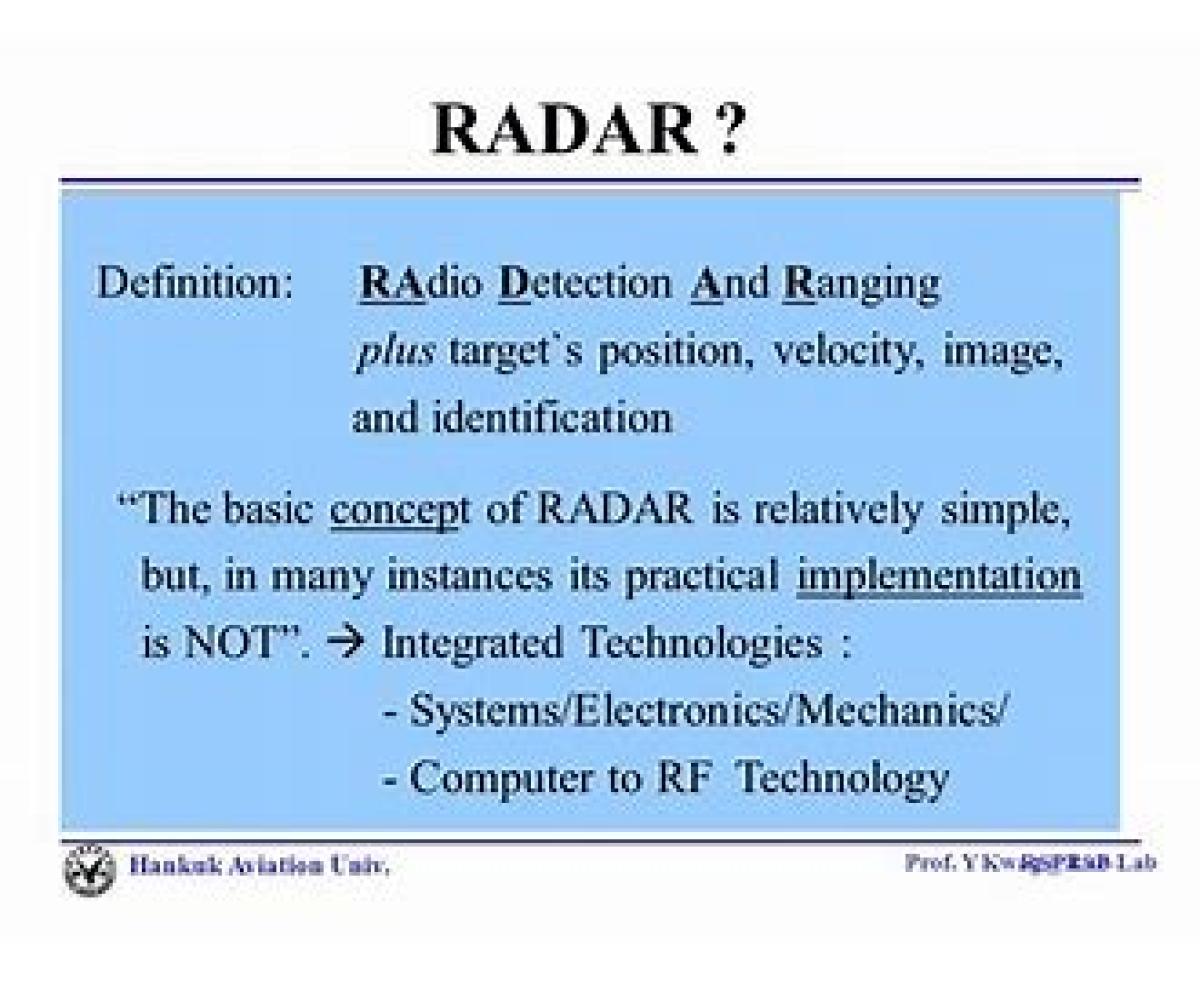 رادار (Radar)، یک دستگاه رادیویی است که برای مشاهده، تشخیص یا آشکارسازی اجسام و نیز اندازهگیری برخی ویژگیهای آنها به کمک موجهای رادیویی به کار میرود. کاربرد اولیهٔ رادار و محل پیدایش و رشد آن در صنایع نظامی و هوانوردی بودهاست. در صنایع نظامی، نقش اصلیِ یک سامانهٔ راداری، نظارت بر یک گسترهٔ بزرگ و تشخیص جسمهای متحرک، ردیابی هدفها و استخراج مشخصههایی مانند فاصله، جهت، سرعت، ارتفاع و اندازهٔ هدف است. رادارهای نظامی برای کاربردهای نظارت، ردیابی هدف، هدایت و ناوبری، و دیدن از پشت موانع ساخته میشوند. کاربردهای غیرنظامیِ رادار در سیستمهای تصویربرداری ماهوارهای، هدایت کشتی و هواپیما، هواشناسی، کنترل ترافیک و اتومبیلهای هوشمند است.